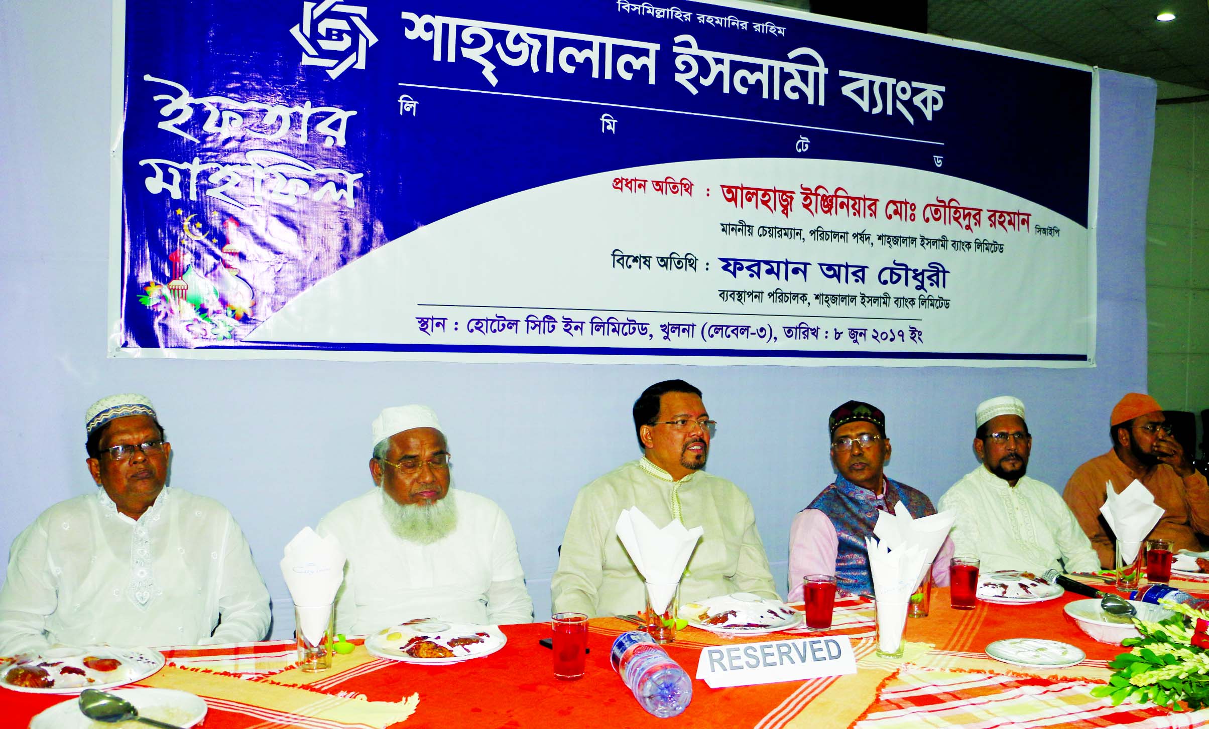 Alhej Engineer Md. Towhidur Rahman, Chairman of Shahjalal Islami Bank Limited, presiding over a discussion on the significance of 'Mahe Ramzan and Iftar Mahfil at a hotel in Khulna city on 8th June. Farman R Chowdhury, Managing Director of the bank, Fazlu