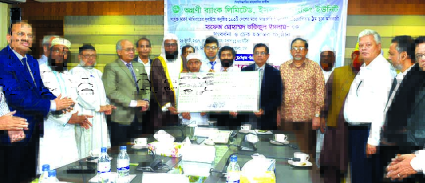 Dr. Zayed Bakht, Chairman of the Board of Directors of Agrani Bank Limited, handing over a cheque of Tk 1 lakh to Hafez Mohammad Tariqul Islam who secured first place in the International Quran Competition among 103 countries in Dubai from Markazut Tahfiz