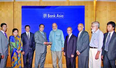 A Rouf Chowdhury, Chairman, Bank Asia hands over a cheque to Kazi Rafiqul Alam, President, Dhaka Ahsania Mission at a function at Uttara on Sunday.