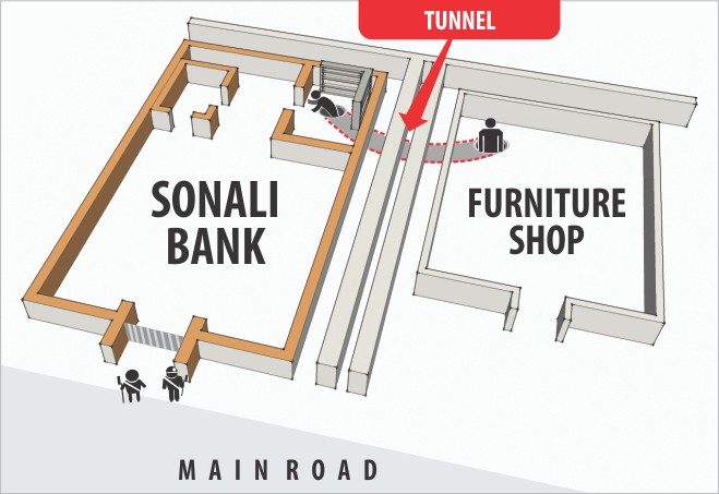 Meanwhile, police yesterday detained six more people in connection with the heist on Friday when Tk 30.8 lakh was looted from the Adamdighi branch through a 30 feet long tunnel being dug from a nearby furniture shop. The perpetrators used blow torches to break open the locker in the vault.