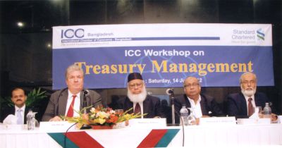 From left, Samiran Chakraborty, head of research at Standard Chartered Bank Mumbai; Jim McCabe, chief executive officer of StanChart Bangladesh; Mahbubur Rahman, president of International Chamber of Commerce Bangladesh (ICCB); Muhammad A (Rumee) Ali, chairman of BRAC Bank, and Ataur Rahman, ICCB secretary general, attend a workshop on treasury management, organised by ICCB, in Dhaka yesterday.