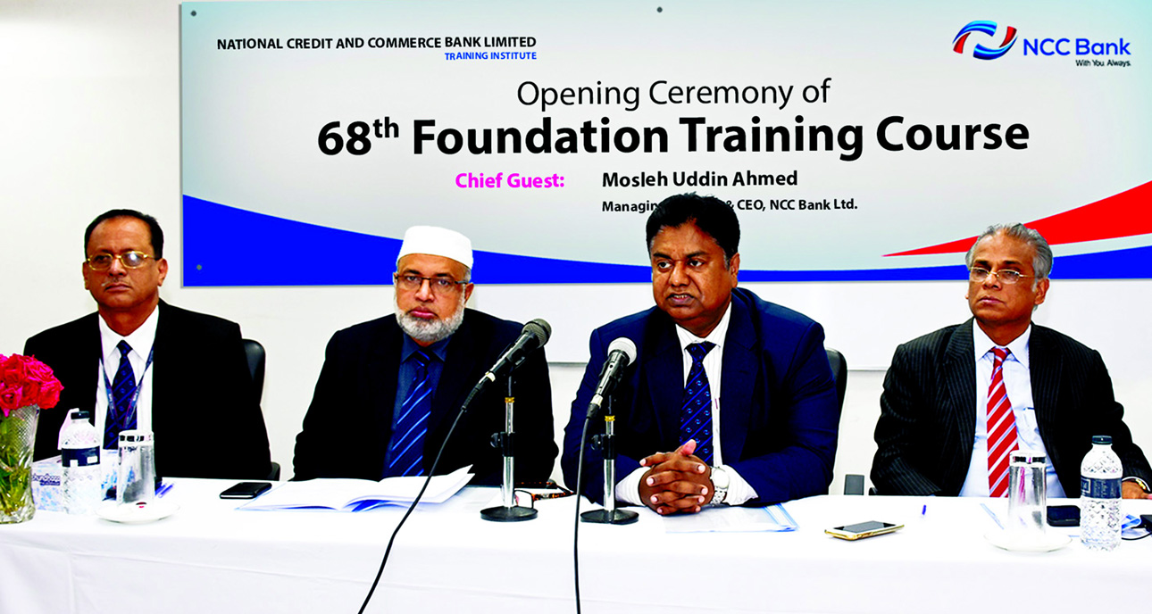 Mosleh Uddin Ahmed, Managing Director (c.c.) of NCC Bank Limited, inaugurating the "68th Foundation Training Course for its Officers" at its training institute on Sunday. Deputy Managing Directors Md. Fazlur Rahman and Md. Habibur Rahman were present amon