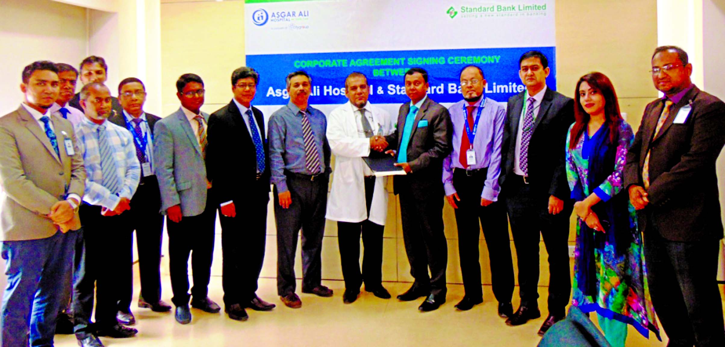 Sharif Zahirul Islam, Head of Cards of Standard Bank Limited and Prof. Dr. Zabrul SM Haque, CEO of Asgar Ali Hospital, exchanging an agreement signing documents at the banks head office recently. Under the deal, cardholders and employees of the bank will