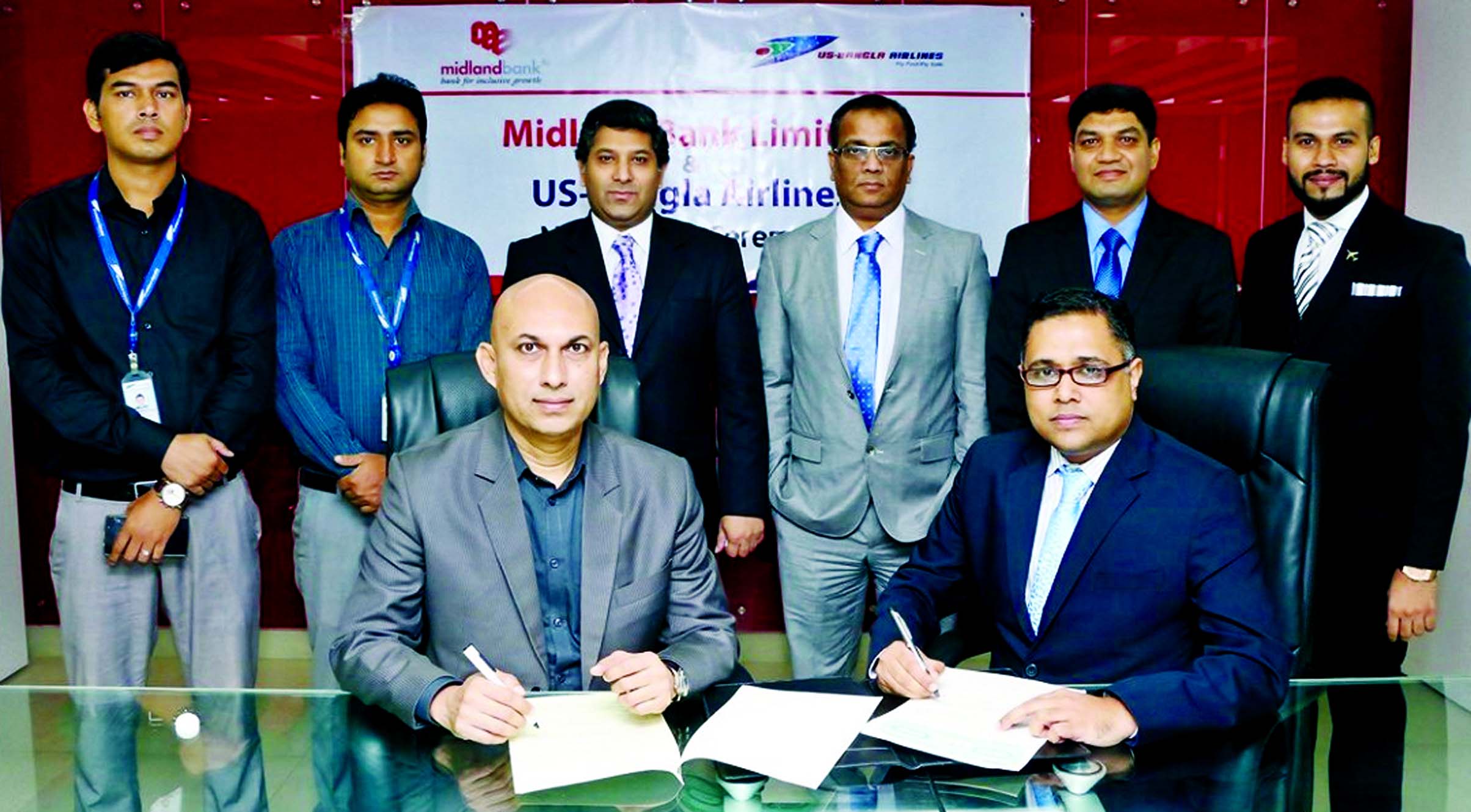 Md. Ridwanul Hoque, SVP of Midland Bank Limited and Sohail Majid, Deputy Director (Marketing & Sales) of US-Bangla Airlines signing an agreement at the bank's head office in the city on Sunday. Under the deal, Visa Credit Card holders of the bank will enj