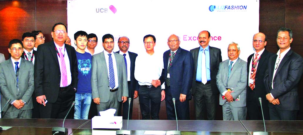 AE Abdul Muhaimen, Managing Director of UCB and Leo Zhuang, Managing Director of Liz Fashion Industry Ltd. shaking hands after inaugurating Internet Banking Service at the bank's head office in the city recently. Top officials from both the organizations