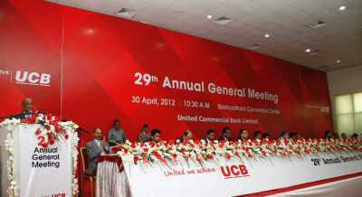 Akhtaruzzaman Chowdhury MP, chairman of United Commercial Bank, presides over the Bank's 29th annual general meeting at Bashundhara Convention Centre in Dhaka recently. The Bank approved 15 percent stock and 12 percent cash dividends for 2011 and increased its authorised capital from Tk 800 crore to Tk 1,500 crore. M Shahjahan Bhuiyan, managing director, was also present. UCB