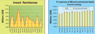 The inflow of remittances during July-October, 2010 fell by $32.63 million or 0.90 percent to $3.576 billion against $3.609 billion during July-October, 2009.