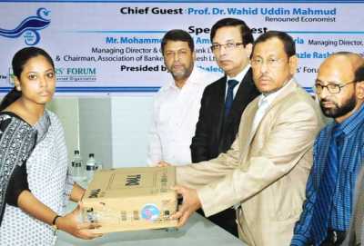 AAM Zakaria, Managing Director, First Security Islami Bank Ltd, hands over a computer to a student at a function in Dhaka on Saturday.