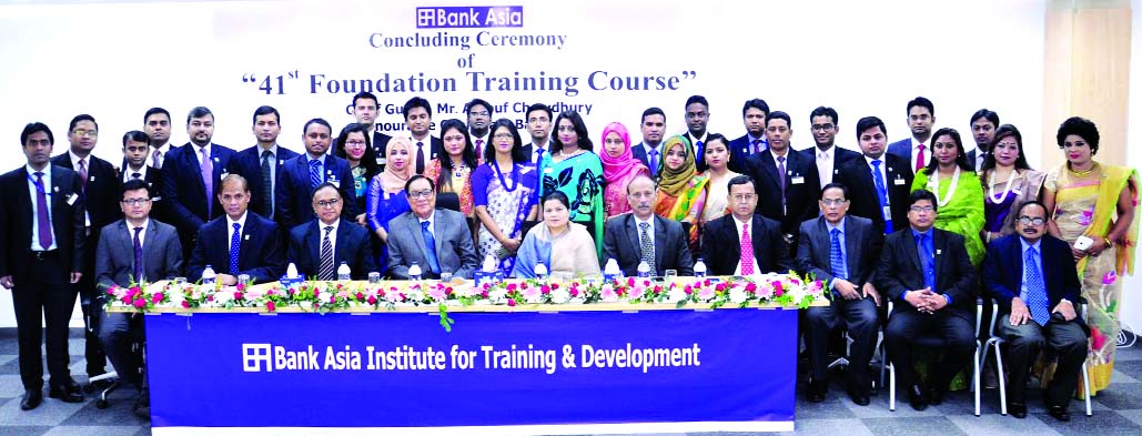 A Rouf Chowdhury, Chairman of Bank Asia poses with participants of 41st Foundation Training Course in BAITD. Managing Director (Current Charge) Humaira Azam, DMDs Mia Quamrul Hasan Chowdhury and Head of Training Azharul Islam were also present.