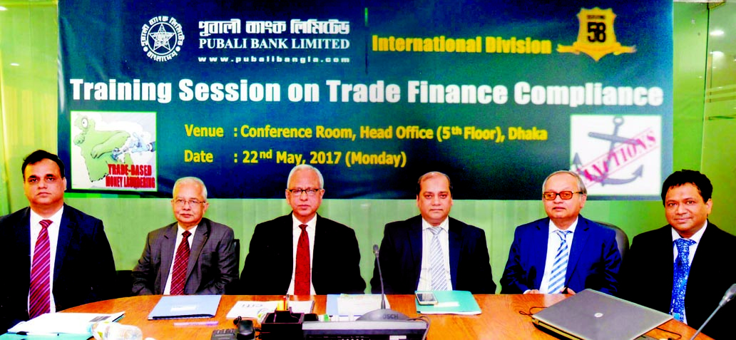 Safiul Alam Khan Chowdhury, Additional Managing Director of Pubali Bank Limited, addressing at a training session on \"Trade Finance Compliance\" at the bank head office in the city recently. Mohammad Ali and Akhtar Hamid Khan, DMD and Mohammad Shahadat H