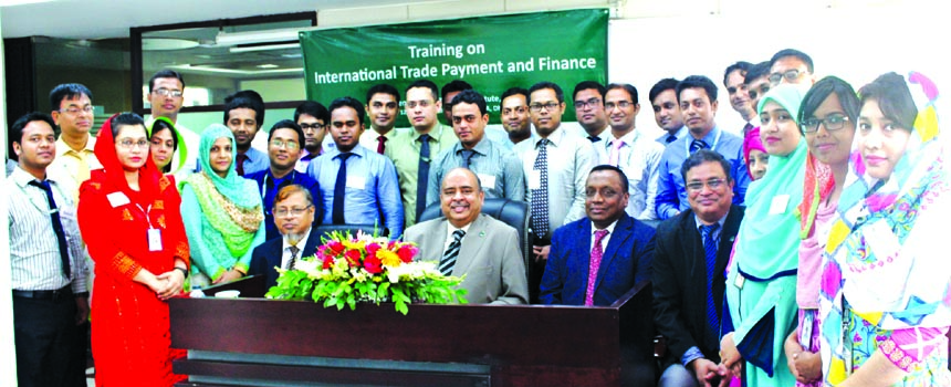 Syed Waseque Md. Ali, Managing Director of First Security Islami Bank Ltd, poses with the participants of a training program on 'International Trade Payment and Finance'at the bank's Training Institute. Md. Ataur Rahman, Principal of Training Institute wa