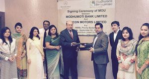 Head of Corporate & Investment Banking of Modhumoti Bank Limited Javed Khan and Chief Operating Officer of Rancon Motors Limited Shoeb Ahmed exchanging documents after signing an MoU on "Priority Clients offering discount on Mercedes-Benz" at a ceremony held in the city on Wednesday