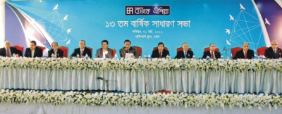 A Rouf Chowdhury, chairman of Bank Asia, attends the Bank's 13th annual general meeting at Officers' Club in Dhaka yesterday. The Bank declared 20 percent stock dividends for 2011. Mohd Safwan Choudhury and Mohammed Lakiotullah, vice chairmen; Rumee A Hossain, chairman of the audit committee; AM Nurul Islam, M Irfan Syed, Mashiur Rahman, Romo Rouf Chowdhury, Shah Md Nurul Alam, directors, and Md Mehmood Husain, managing director, were also present.