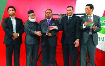 Social Islami Bank Limited (SIBL) chairman Kamaluddin Ahmed and President of ICC-Bangladesh Mahbubur Rahman handing over an award to Shaikh Siraj for his contribution in the field of agriculture development to mark the completion of 16 years of the bank Monday. Former president of FBCCI Annisul Huq and SIBL managing director Muhammad Ali also seen. The bank honoured eight eminent persons for making outstanding contributions in the field of their respective areas.