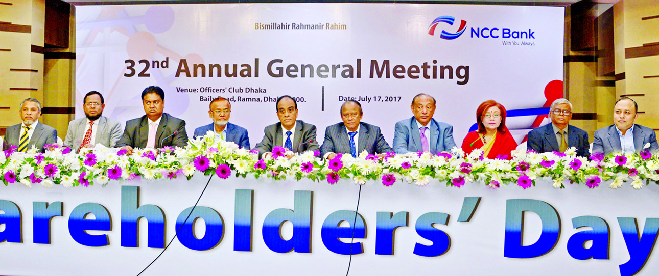Abdus Salam, Chairman of NCC Bank Limited, presiding over its 32nd AGM at the Officers\' Club in the city on Monday. The AGM approved 16pc cash dividend for the year 2016. Mosleh Uddin Ahmed, Managing Director, ASM Mainuddin Monem,Vice-Chairman, SM Abu Mo
