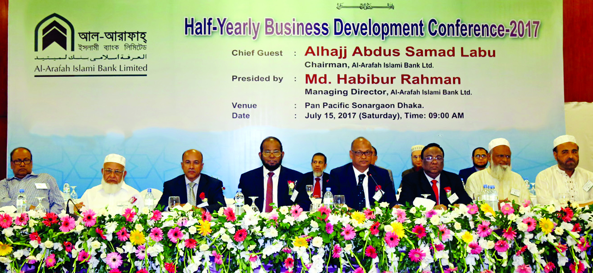 Abdus Samad Labu, Chairman of Al-Arafah Islami Bank Ltd. presiding over its Half-Yearly Business Development Conference 2017 at a city hotel on Saturday. Md. Habibur Rahman, Managing Director, Md. Abdus Salam, Vice- Chairman, Nazmul Ahsan Khaled, Md. Haru
