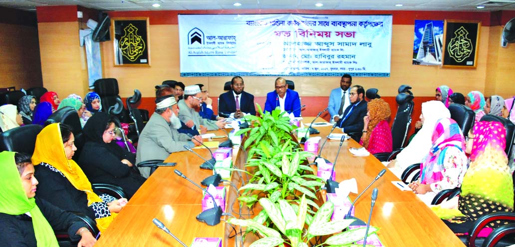 Abdus Samad Labu, Chairman of Al-Arafah Islami Bank Ltd. presiding over its view exchange meeting with the female employees of the bank at its head office in the city on Wednesday. Md Habibur Rahman, Managing Director, Kazi Towhidul Alam, Md Fazlul Karim,