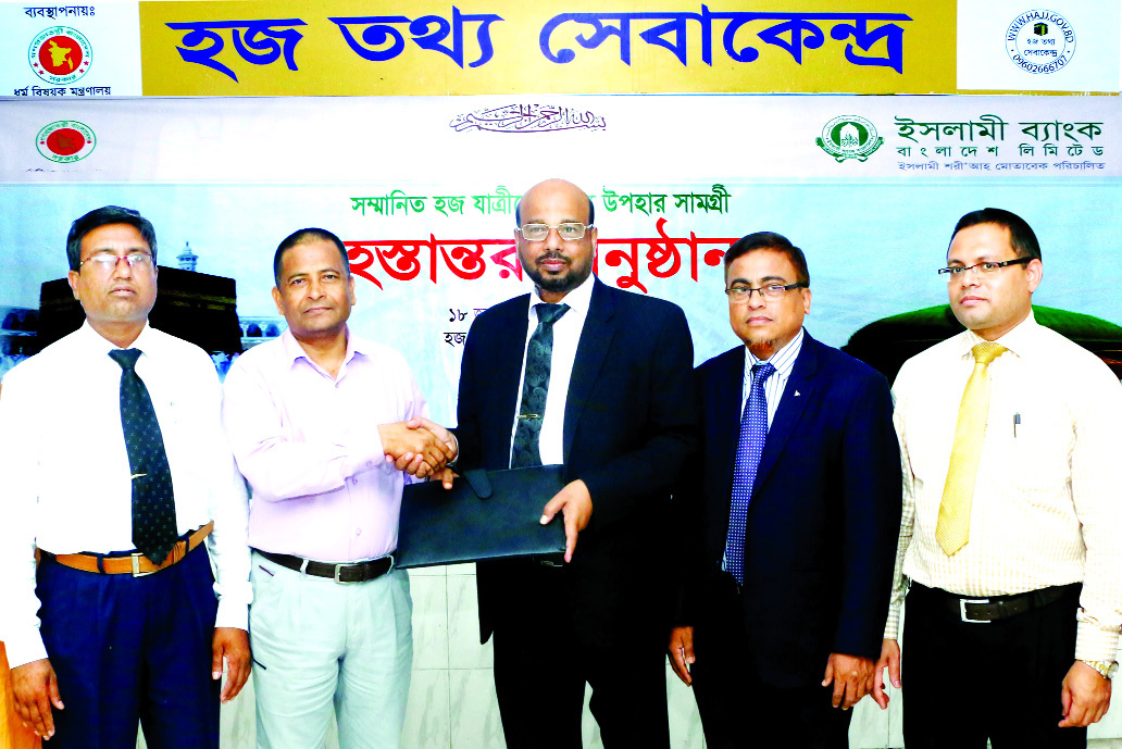 Abu Reza Md Yeahia, Deputy Managing Director and Head of Development Wing of Islami Bank Bangladesh Limited, handing over bed foam with cover for pilgrims to Md Saiful Islam, Deputy Secretary of Religious Affairs Ministry at Ashkona hajj office onTuesday.