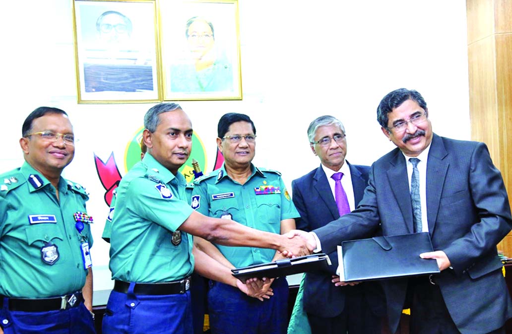 Ahmed Kamal Khan Chowdhury, Managing Director of Prime Bank and Md. Assaduzzaman Mia, Dhaka Metropolitan Police (DMP) Commissioner exchanging an MOU signing documents at the bank\'s head office in the city recently. Under the agreement, all members of DMP