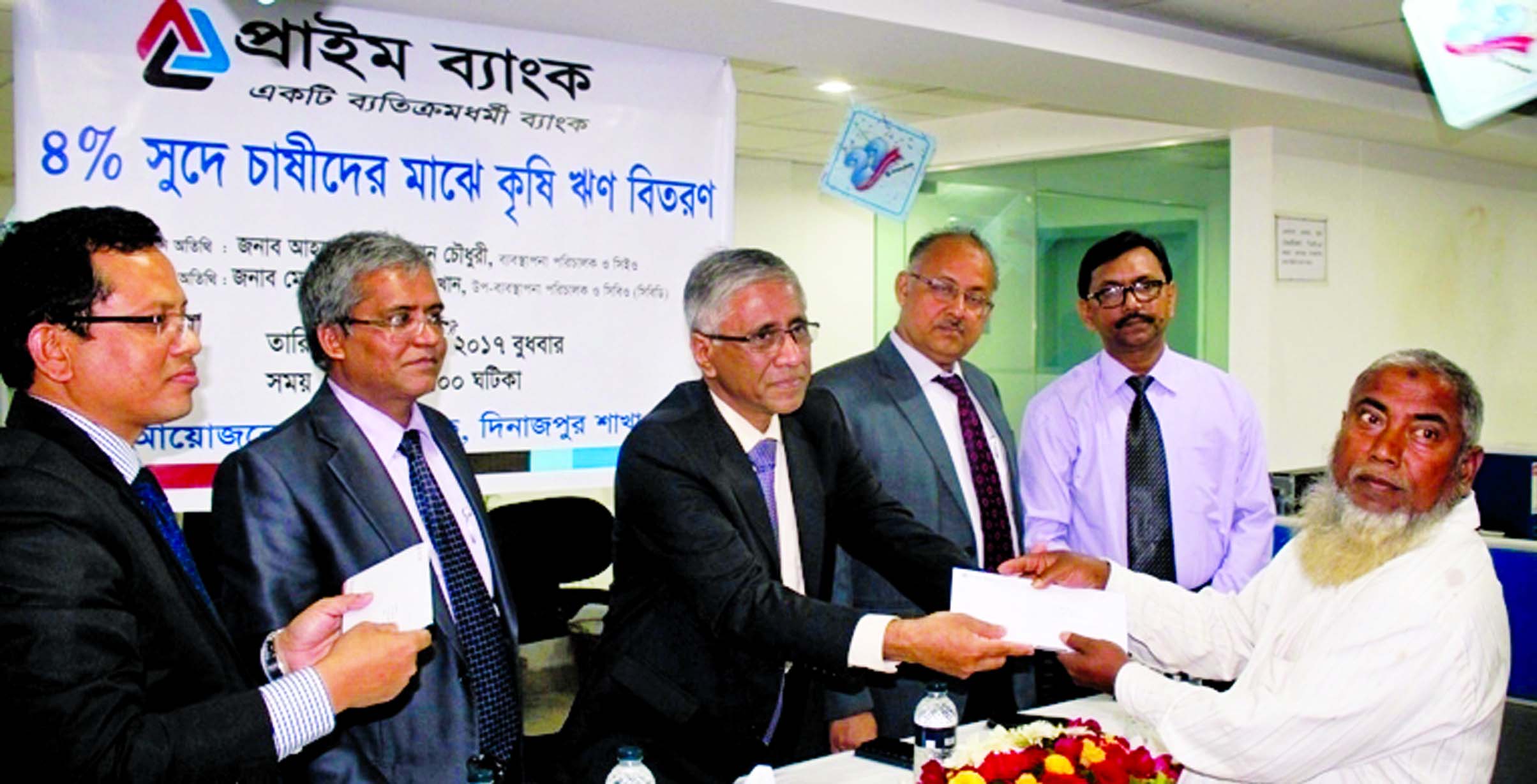 Ahmed Kamal Khan Chowdhury, Managing Director of Prime Bank Ltd, distributing Crop Loan to farmers at Dinajpur Branch recently. Md Touhidul Alam Khan, DMD, Imtiaz Ahamed Bhuiyan, EVP, AKM Enamul Haque, VP and Pijuce Kumar Roy, Head of the branch were pres
