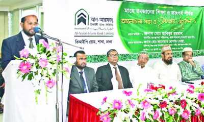 Md Habibur Rahman, Managing Director, Al-Arafah Islami Bank Limited, speaks at a discussion meeting on ‘Mahe Ramjaner Shikkha o Tatporjo’ at the bank’s VIP Road branch on Monday.