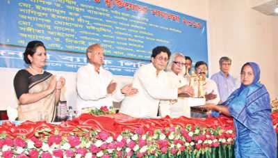 Prof Dr. Abul Barakat, Chairman of Janata Bank Limited and Belal Mohammad, honours a freedom fighter in Chittagong on Saturday.