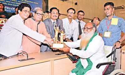 Prof. Dr Abul Barakat, chairman of Janata Bank, and Prof. Dr Anisuzzaman, Emeritus Professor of Dhaka University, hand over a crest to a freedom fighter, awarded by Janata Bank, during a function at DU Thursday.