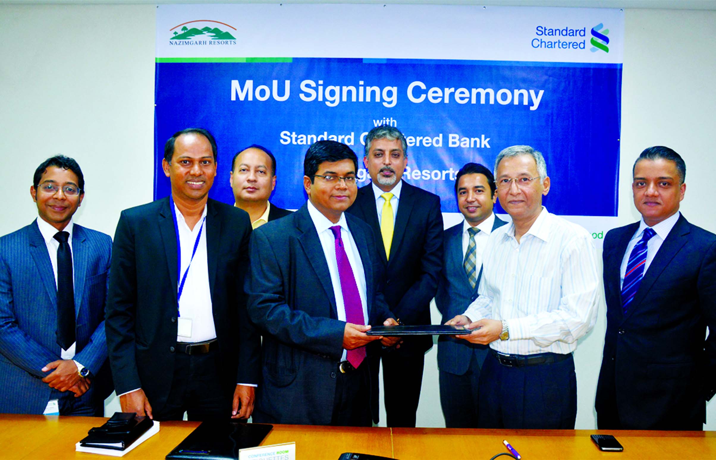 Makam E Mahmud Billah, Head of Retail Products of Standard Chartered Bank and Nazim Shafkat Choudhury, Director of Nazimgarh Resorts in Sylhet exchanging a MoU signing documents in the city recently. Under the deal, the resorts will provide a range of exc
