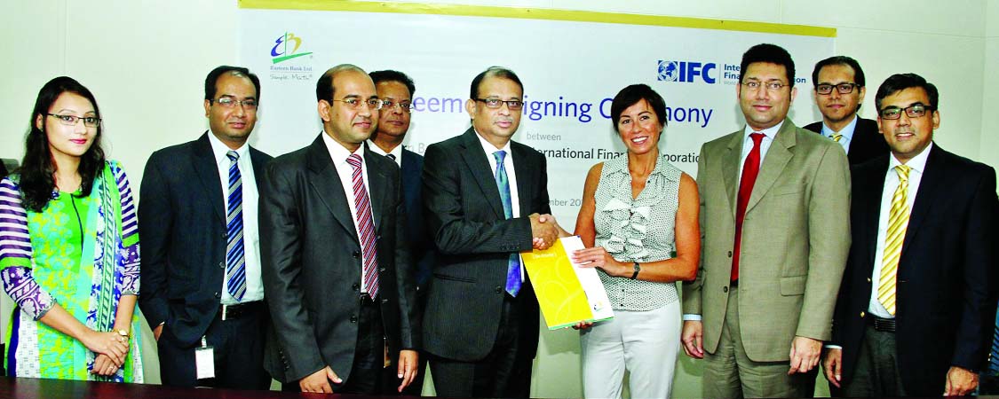 Ali Reza Iftekhar, Managing Director of Eastern Bank Ltd and Inessa Tolokonnikova, Industry Manager of FIG, South Asia Region of IFC exchanging documents after signing a short term rollover foreign currency loan agreement in Dhaka recently. EBL Deputy Man
