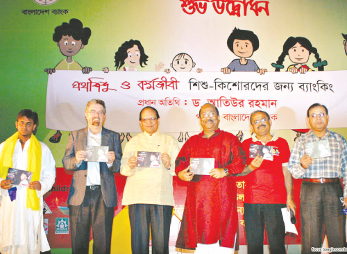 Bangladesh Bank governor Atiur Rahman inaugurates the banking service for the street children, which will allow them to open a bank account with Tk 10, at a ceremony in city’s Bangla Academy on Saturday.
