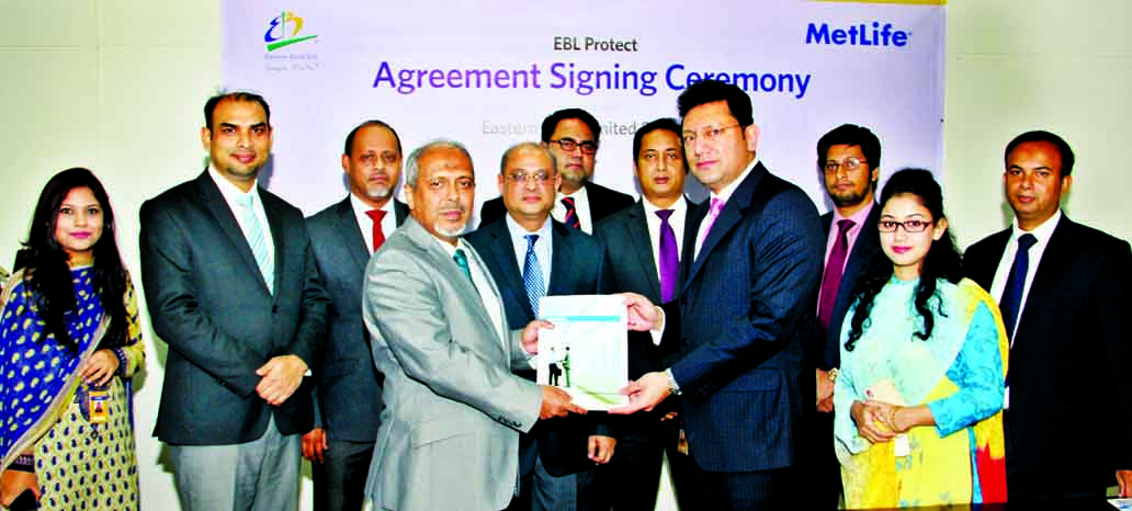 Hassan O. Rashid, Additional Managing Director of Eastern Bank Limited and Syed Hammadul Karim, Vice President of MetLife Bangladesh exchanging an agreement signing documents in the city recently. Under the deal, Commercial and SME Banking Customers of th