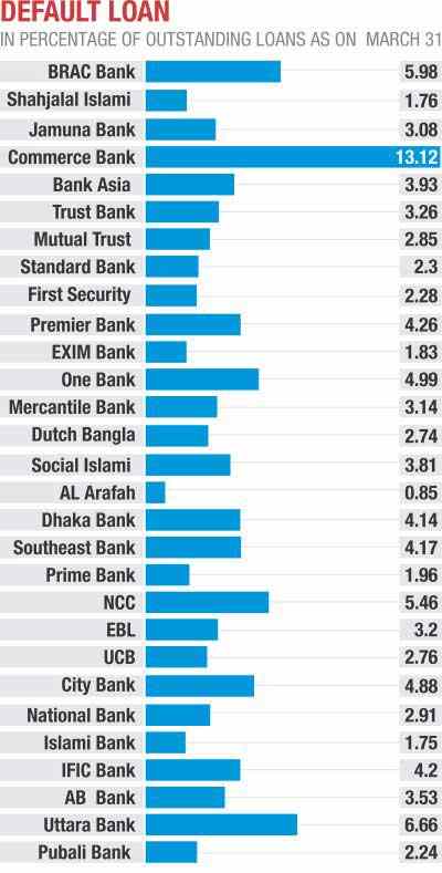 According to Bangladesh Bank (BB) statistics, banks had default loans worth Tk 25,298 crore or 6.57 percent of their outstanding loans on March 30, up from Tk 22,644 crore or 6.12 percent on December 31, 2011.