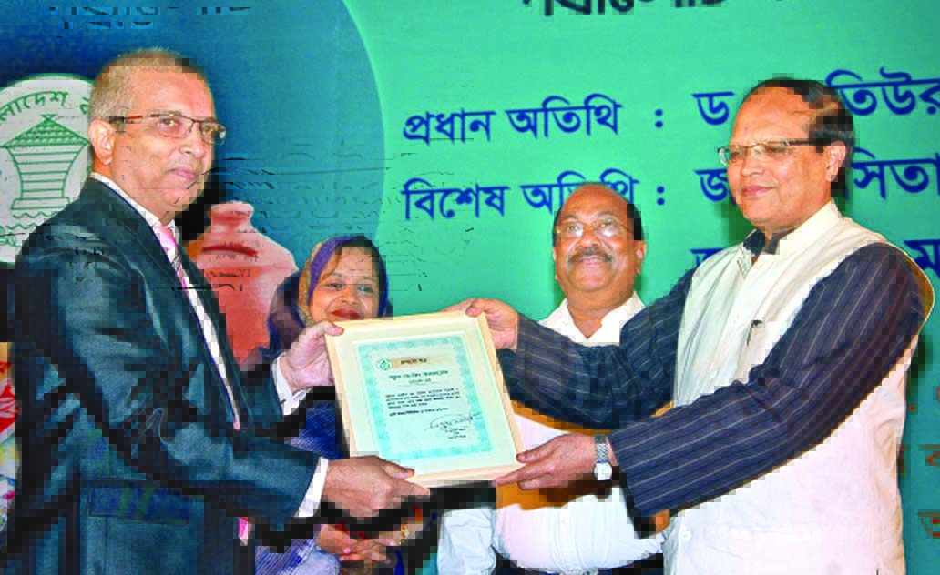Bangladesh Bank Governor Dr Atiur Rahman, handing over a certificate to Md Shakir Amin Chowdhury, Deputy Managing Director of Dhaka Bank Ltd for contribution towards School Banking in Chittagong Region at Bangladesh Bank Training Institute recently.