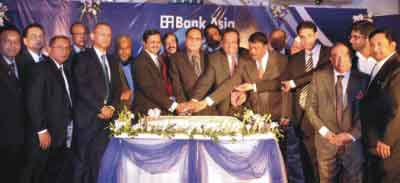 Bank Asia Chairman A Rouf Chowdhury cuts a cake at a programme to celebrate the Bank's 12th anniversary at Khulna Club in Khulna recently. Directors Rumee A Hossain, AM Nurul Islam and M Irfan Syed and President and Managing Director Md Mehmood Husain were also present.
