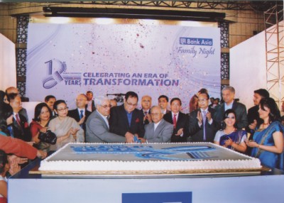 A Rouf Chowdhury, chairman of Bank Asia, cuts a cake at a programme to celebrate the Bank's 12th anniversary at Bangabandhu International Conference Centre in Dhaka on Sunday. M Syeduzzaman and Anisur Rahman Sinha, former chairmen, were also present.