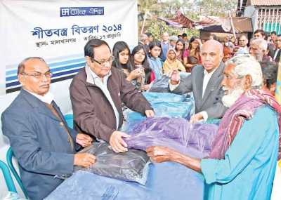 A Rouf Chowdhury, Chairman of Bank Asia Limited, distributes blankets among cold-hit villagers of Malkhanagor in Sirajdikhan upazila of Munshigonj district recently.