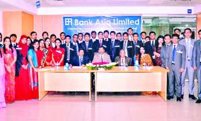 Md. Mehmood Husain, President and Managing Director of Bank Asia, Badruddin Ahmed, Training Consultant and Sujit Kumer Sen, Assistant Vice President and Head of Training are seen with the participants of Training on Foreign Exchange for 7th batch Management Trainees held at the Bank's Training Institute at Panthapath, Dhaka recently.