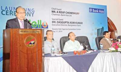 AM Nurul Islam, Vice Chairman, Bank Asia, speaks at the launching ceremony of mobile financial service ‘Hello’ at Spectra Convention Centre at Gulshan in Dhaka on Saturday. Bank Asia launched its mobile financial service ‘Hello’ aiming to bring a large number of unbanked population of the country under financial service network.