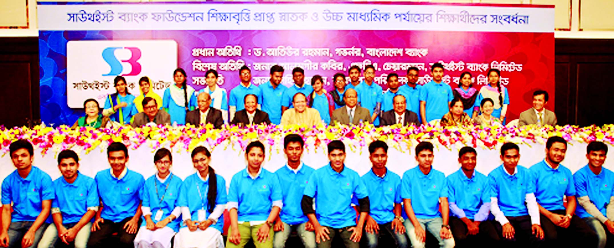 Bangladesh Bank Dr Atiur Rahman poses with the students of a Southeast Bank Foundation scholarship programme at a city hotel on Saturday. Shahid Hossain, Managing Director and Alamgir Kabir, Chairman of the Board of Directors of Southeast Bank were presen