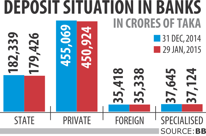 Bank-wise, deposits at state lenders went down by 1.59 percent in January compared to December, according to statistics from Bangladesh Bank.