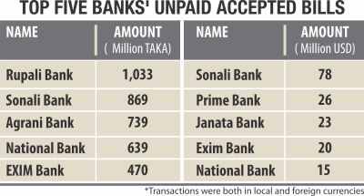 A number of banks on several occasions had accepted foreign and local bills against letters of credit, but did not pay the dues of other banks in time. The amount of such unpaid bills stood at $363 million or Tk 2,976 crore as of June 30.