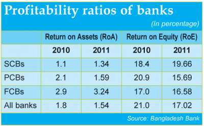 The operating foreign commercial banks (FCBs) in the country showed improvements in their RoA - from 2.9% in 2010 to 3.24% in 2011 - but their RoE witnessed a modest decline - from 17.0% in 2010 to 16.58% in 2011. All the nine FCBs, having their operations in Bangladesh, earned an aggregate amount of Tk 22.97 billion as operational profits in 2011.