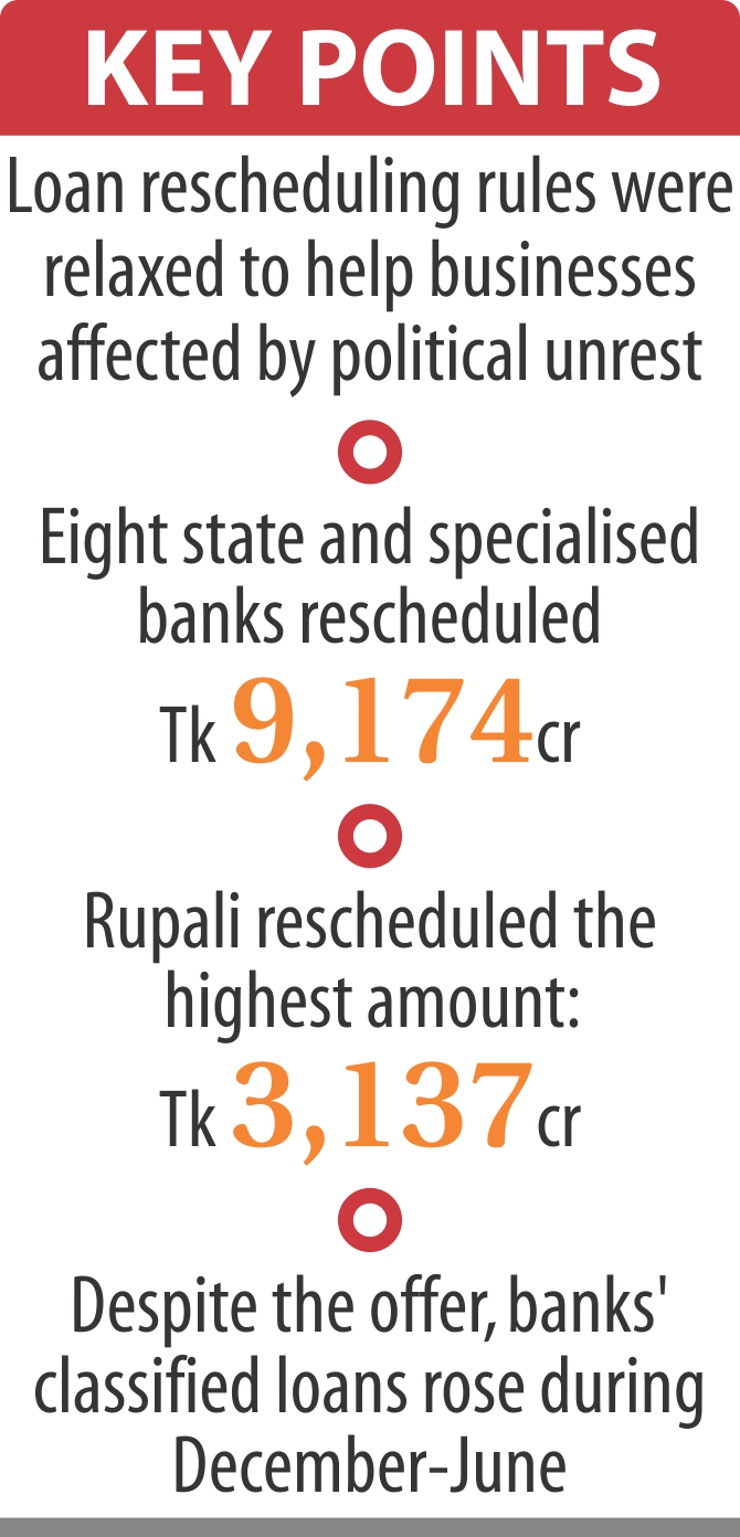 Central bank inspection teams, during their regular visits to different banks, took with them a list of the loans rescheduled by the banks under the special facility and checked their status. Among the state banks, Rupali rescheduled the highest amount of loans worth Tk 3,137 crore, followed by Agrani Bank's Tk 2,062 crore, according to the BB.