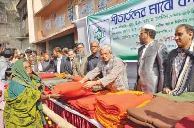 Nuh-ul-Alam Lenin, Presidium Member, Awami League, hands over blanket to a cold-hit woman at a function in the city’s Lalbagh Community Centre premises in Dhaka on Sunday.