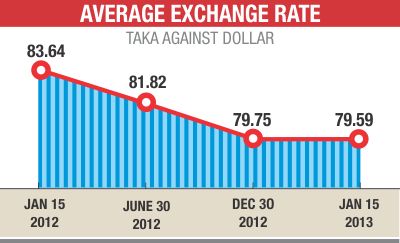 On January 15, the taka's weighted average rate against the dollar stood at Tk 79.59, down from the Tk 83.68 recorded for the same date a year ago.