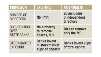According to the amendment, banks’ exposure to the capital market has been lowered to 25 percent of their total regulatory capital. The existing law allows banks to invest 10 percent of their deposits in the stockmarket.
