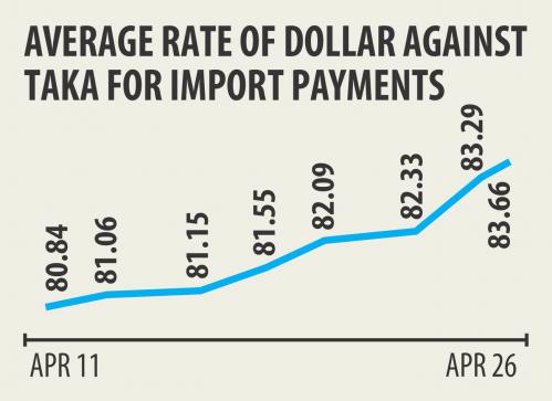 The average Bills for Collection (BC) selling rate crept up 3.49 percent to Tk 83.66 against the dollar in just two weeks since April 11, according to data from Bangladesh Foreign Exchange Dealers' Association (BAFEDA). Banks use this rate to sell dollars to importers.