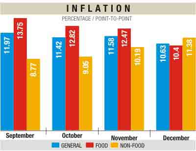 According to the BBS, the overall inflation rate decreased by 0.95 percentage point from November and stood at 10.63 percent in December due to a fall in food inflation.