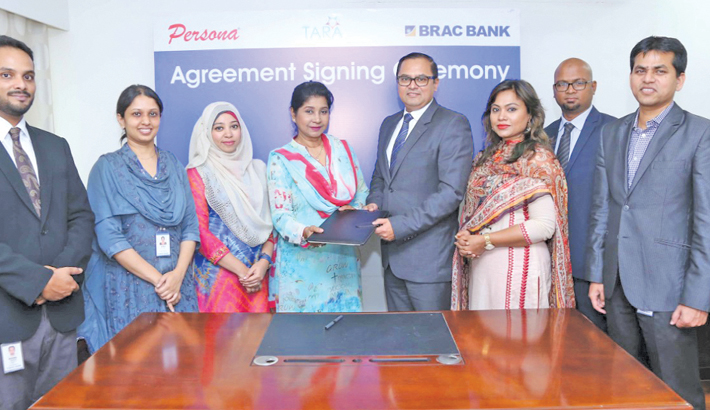 Kaniz Almas Khan, CEO and Managing Director, and Nusrat Jabin, Senior Official from Persona, and Syed Abdul Momen, Head of SME Banking (acting), Sarah Anam, Head of Deposits and NFB, Retail Banking, Shajed Al Haque, Senior Manager, Business Analysis, SME Banking, and Mehruba Reza, Senior Product Manager, Women Banking Segment TARA, BRAC Bank, and other officials were present at the signing ceremony.