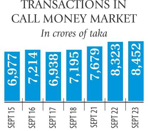 Total transactions in the market also increased in the past one week. A total of Tk 8,452 crore was transacted in the call money market yesterday, up by Tk 129 crore from the previous day, ahead of Eid-ul-Azha and Durga Puja.
